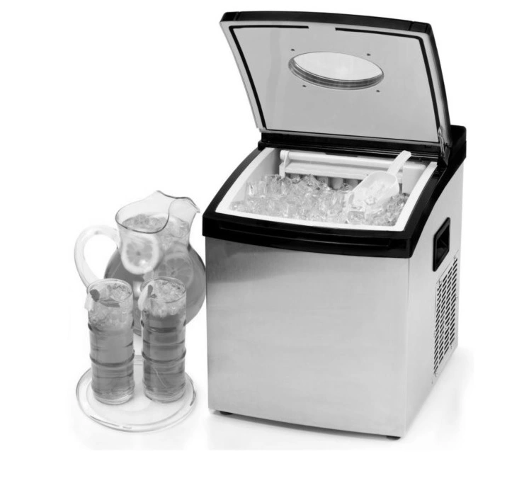 Льдогенератор т.м. EKSI серии EC, мод. EC 15A, 305х350х360мм, 150Вт, 220В, емкость бункера 1 кг, производительность 15 кг, материал корпуса: нержавеющая сталь, тип льда: кубик, тип подачи воды: заливной, тип охлаждения: воздушный, возможность регулирования размера льда – да, 2 размера, в порции 24 кубика, вес 13,5кг, R600a