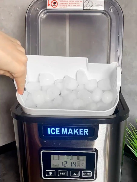 Охлаждение в приборе производится при помощи компрессора с экологически чистым хладагентом R600a по принципу обычного холодильника. Просто залейте чистую воду в резервуар (2,2 литра) и нажмите кнопку. Остальное ледогенератор сделает сам.