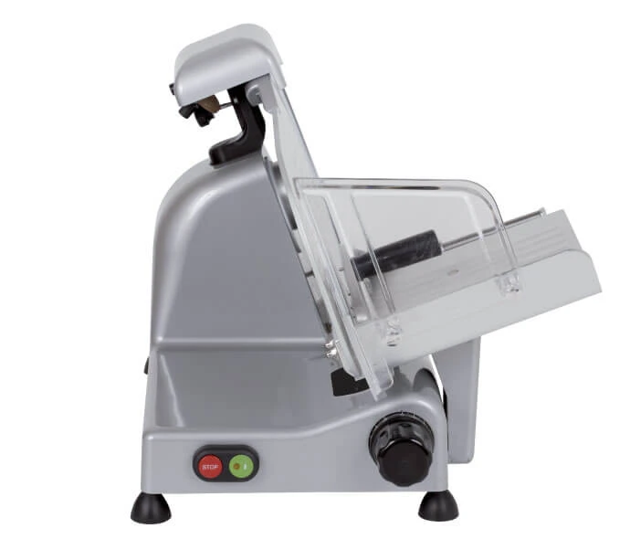 Производительность 22кг/ч, габариты 530х442х355, мощность 140кВт, напряжение 220В. Слайсер предназначен для профессиональной нарезки различных продуктов (колбасных изделий, сыра, хлеба) с помощью лезвия из хромированной стали. Корпус изготовлен из анодированного алюминия. Слайсер оборудован вентилируемым мотором, защищающим от прибор от перегрева. Толщина нарезки 0-15 мм. Диаметр ножа – 220 мм. Максимальный размер нарезаемого продукта – 210х135 мм.