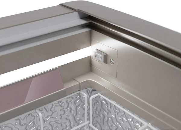 Ларь-бонета Haier GTS1850G с разделителями (серый) 1850х860х810,Вес нетто (кг): 130,Мощность (Вт): 350,Напряжение (В): 220,Объем номинальный (л): 549,,,Энергопотребление (кВт\сутки): 7,,Наличие подсветки: Да,,,T (max): 10, T (min): -24,Температурный режим: 0...+10/-12...-24,T (min): -24, T (max): 10, Объем номинальный (л): 549, Вес нетто (кг): 130, Тип крышки: С гнутым стеклом, Наличие колес: Нет, Мощность (Вт): 350. Подключение- 2 вилки.