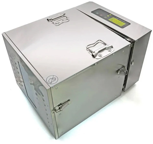 Дегидратор-сушилка настольный с 10 решетками (лотками) размером 396x396мм, электронным управлением, таймером на 24ч имеет корпус и лотки из нержавеющей стали. Рабочая температура: +20/+90С. Оборудование предназначено для использования на предприятиях общественного питания и применяется для дегидрации (высушивания) таких продуктов, как ягоды, фрукты, овощи, рыба и т.д