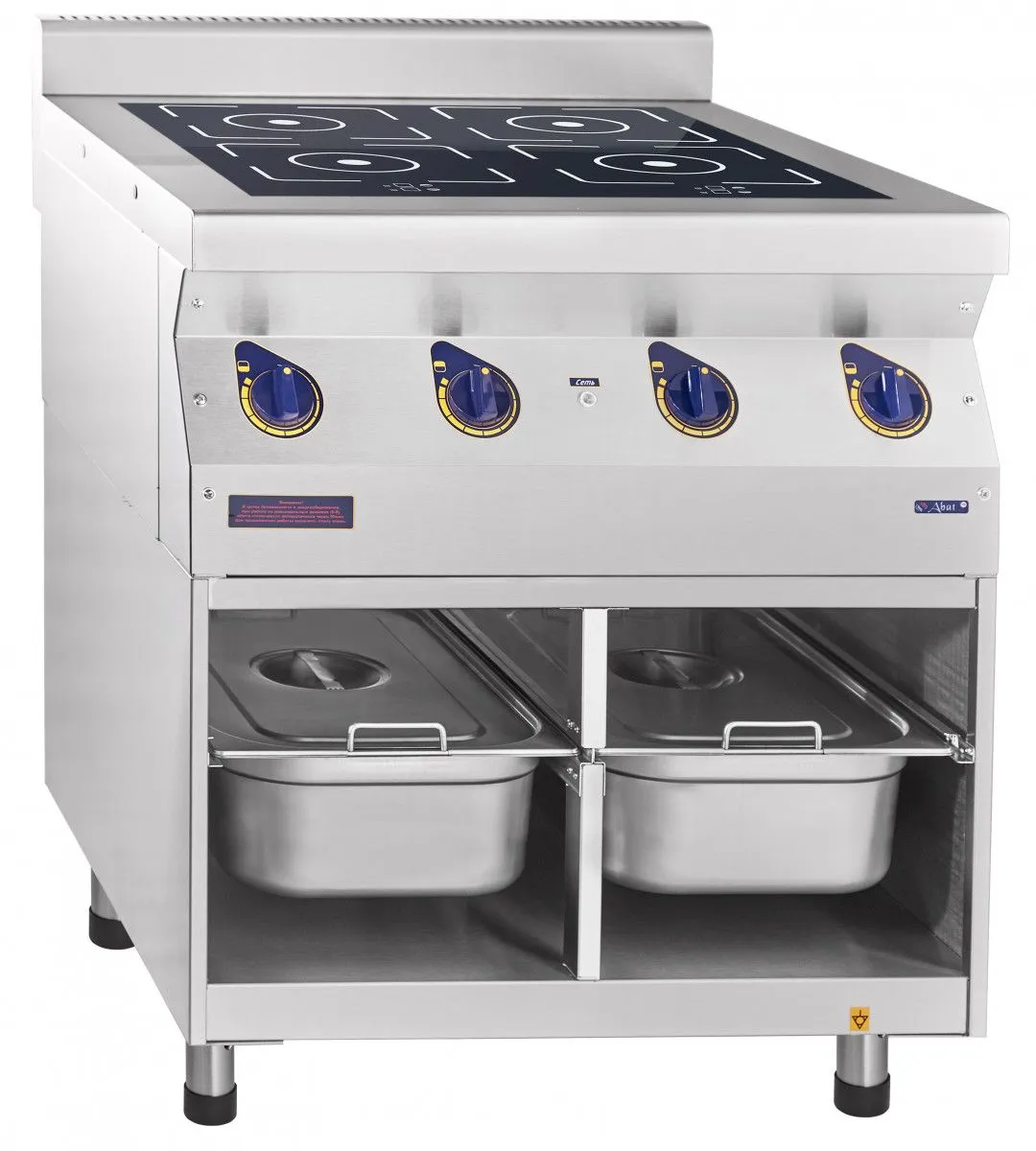Плита индукционная четырехконфорочная КИП-47Н для приготовления первых, вторых и третьих блюд в наплитной посуде. Используемая посуда должна обладать магнитными свойствами (к ней должен притягиваться магнит) и иметь плоское дно. Может использоваться посуда из нержавеющей стали или алюминия с ферромагнитным дном, чугунная посуда.