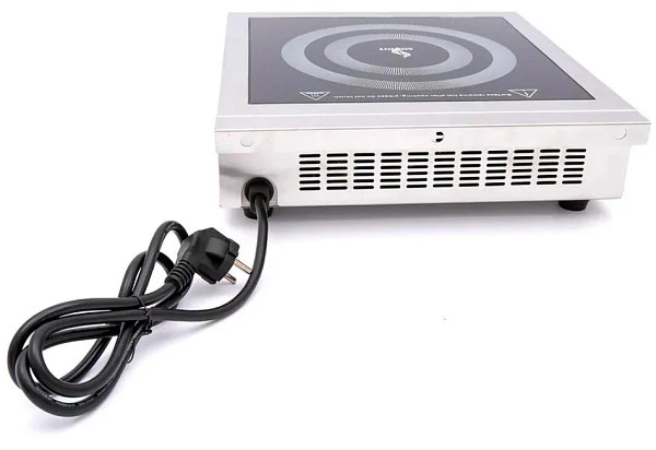 Плита электрическая, индукционная, настольная с 1 конфоркой, электронным управлением, 13 уровнями мощности (500-3500Вт), 10 температурными режимами, электронным таймером на 24ч, изготовлена из нержавеющей стали. Рабочая температура: +60/+240С. Под стеклянной поверхностью плиты находится медная катушка, по которой протекает высокочастотный электрический ток. По законам, открытым Фарадеем, магнитное поле этого тока, пронизывая дно посуды, наводит в нем электрические токи. Крутящиеся в дне кастрюли вихревые электрические токи разогревают дно, а с ним, соответственно, и пищу. Нагревается непосредственно дно посуды, а не поверхность плиты, поэтому нагрев происходит быстрее и экономит время для приготовления пищи. Для индукционных плит используется специальная посуда, дно которой имеет слой ферромагнитного металла. Без стоящей на ней посуды плита нагреваться не будет, что значительно экономит потреблении энергии и обезопасит от ожогов, т.к. поверхность плиты остается холодной даже в момент приготовления пищи. Макс.нагрузка на поверхность - 25кг.
