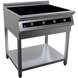 Плита электрическая индукционная на открытом стенде с нижней сплошной полкой, со сплошной стеклокерамической поверхностью с 4 конфорками изготовлена из нержавеющей стали AISI 304. Мощность каждой конфорки - 3500Вт. Индукционное оборудование не требует предварительного разогрева зон, характеризуется быстрым закипанием, низким потреблением электроэнергии, высоким КПД. Максимальная экономия энергии осуществляется благодаря тому, что разогрев зоны приготовления пищи происходит только тогда, когда посуда находится в прямом контакте с поверхностью. Зона разогрева самостоятельно регулируется в зависимости от диаметра посуды. При снятии посуды с поверхности немедленно происходит автоматическое выключение. Электронная панель управления с цифровой индикацией и 13 уровней нагрева имеет таймер на 180 минут. Регулируемые по высоте ножки в комплекте. Плита может использоваться как независимо, так и в составе линии приготовления 700.