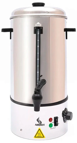 Водонагреватель-кипятильник электрический настольный заливного типа, без подключения к водопроводу, оснащен регулируемым рабочим термостатом, аварийным термостатом, краном, мерной стеклянной шкалой, 2 пластиковыми ручками для переноски, закрытым съёмным ТЭНом, индикатором нагрева, автоматическим контролем уровня и температуры воды. Рабочая температура: +30/+95С. Объём: полный - 10л. Корпус изготовлен из нержавеющей стали. Электрокипятильник предназначен для быстрого получения кипяченой воды и обслуживания большого количества людей. Оптимален на линиях раздачи в кафе, барах, ресторанах, закусочных, столовых, на предприятиях общественного питания, в детских садах, школах, офисах, в медицинских заведениях.