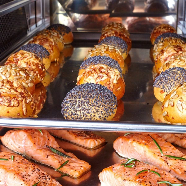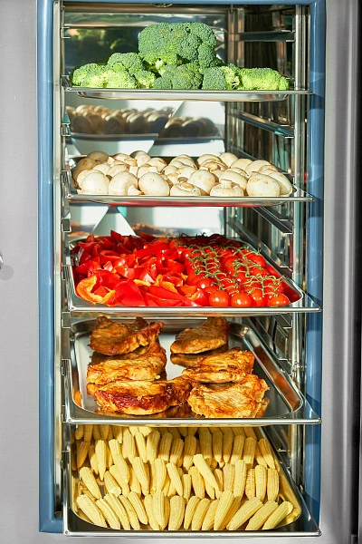 Продольная загрузка позволяет использовать гастроемкости GN1/1, GN1/2 и GN1/3 (в комплект не входят). Расстояние между уровнями — 70 мм.