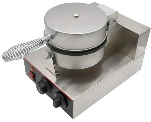 Вафельница электрическая настольная с электромеханическим управлением, таймером имеет круглую рабочую поверхность D185мм, разделённую на 4 треугольных сегмента для выпечки бельгийских вафель; 4 ножки. Толщина вафли - ок.12мм. Время приготовления — 2-3мин. Рабочие поверхности изготовлены из алюминия и имеют антипригарное покрытие. Корпус выполнен из нержавеющей стали. Температурный режим: +50/+300С