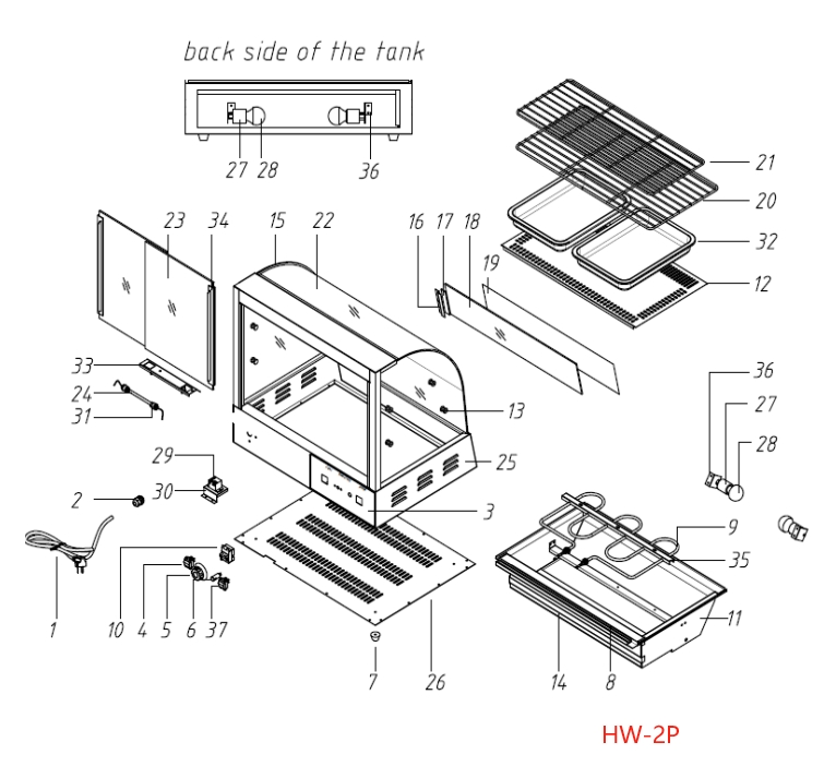 Витрина тепловая, 3 яруса: 2 полки-решетки, основание с 2-мя поддонами, темп.режим +30..+80С.
