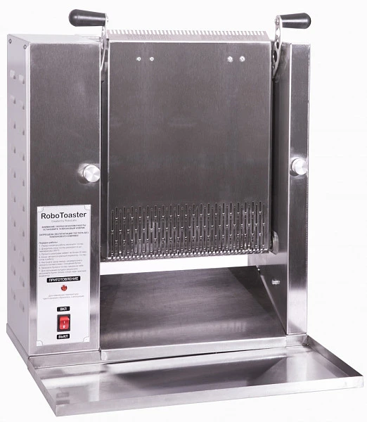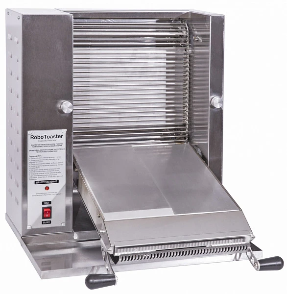 Тостер контактный конвейерный вертикальный с электромеханическим управлением RoboToaster от RoboLabs предназначен для карамелизации булочек. Модель имеет конвейерную сетку из нержавеющего прутка диаметром 4мм, наклонную рабочую плоскость для удобства загрузки, съёмные наклонный лоток для булок, с возможностью установки в двух направлениях. Алюминиевая нагревательная поверхность обеспечивает быструю и равномерную карамелизацию булок. Сахар, входящий в состав булочек, под действием высокой температуры образует золотисто-коричневую корочку на срезе половинки булки. В дальнейшем, при формировании бургера эта корочка способствует тому, что соус не проникает глубоко в булочку, не размачивает изделие и не деформирует его. Сама же булочка при прохождении через тостер не подогревается и, таким образом, не пересушивается. Регулируемый зазор между нагревательной поверхностью и сеткой позволяет карамелизовать разрезанные булки толщиной до 40мм, а минимальный выставляемый зазор составляет 5мм. Контактная часть, тефлоновый коврик, является расходным материалом, в комплекте поставляются два коврика. Тостер оборудован лотком для хранения готовых булочек.
