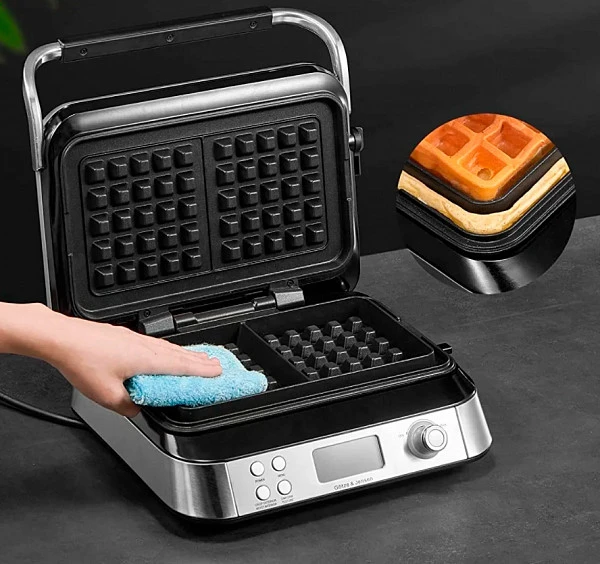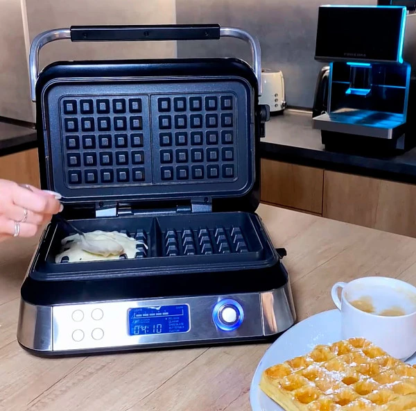 Электронная панель управления позволяет выбрать одну из четырех готовых программ приготовления (бельгийские, шоколадные, классические, пахтовые) или настроить свои параметры. Вафельница для венских вафель имеет: